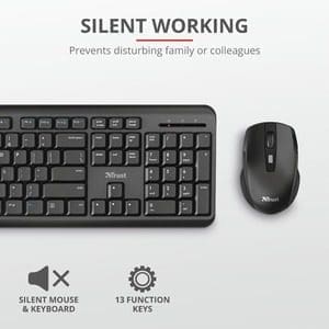 El teclado inalámbrico silencioso con ratón Trust Ody es la combinación adecuada para que su trabajo sea más cómodo que antes. Las teclas silenciosas evitan que otros sean molestados por su trabajo, el teclado en sí es resistente a derrames y, gracias a que este conjunto es inalámbrico, proporcionará mucha flexibilidad. El teclado inalámbrico silencioso Ody ofrece todo lo que necesita para una experiencia de escritura fluida. El diseño completo de bajo perfil tiene una pulsación de tecla silenciosa, mientras que el ángulo ajustable y las patas de goma antideslizantes lo ayudarán a trabajar cómodamente durante horas. Es resistente a derrames y tiene 12 teclas de función multimedia.